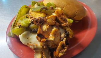 The ‘Works!’ Filled with Meatless Chicken Steak, Fried Onions, Peppers, Mushrooms, Marinara & American Cheese.....13.19