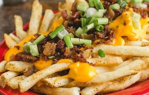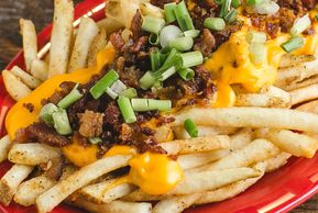 A Large Seasoned Fry Smothered in Cheese Sauce and topped with Bacon and Scallions. Comes with a side of Sour Cream....9.19