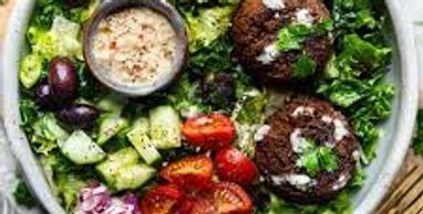 3 of our Homemade Falafel Balls on Mixed Greens with Israeli Salad, Tahini Sauce & Carrot. Comes with Pita Wedges and a SIDE of our Homemade Goddess Dressing...13.5