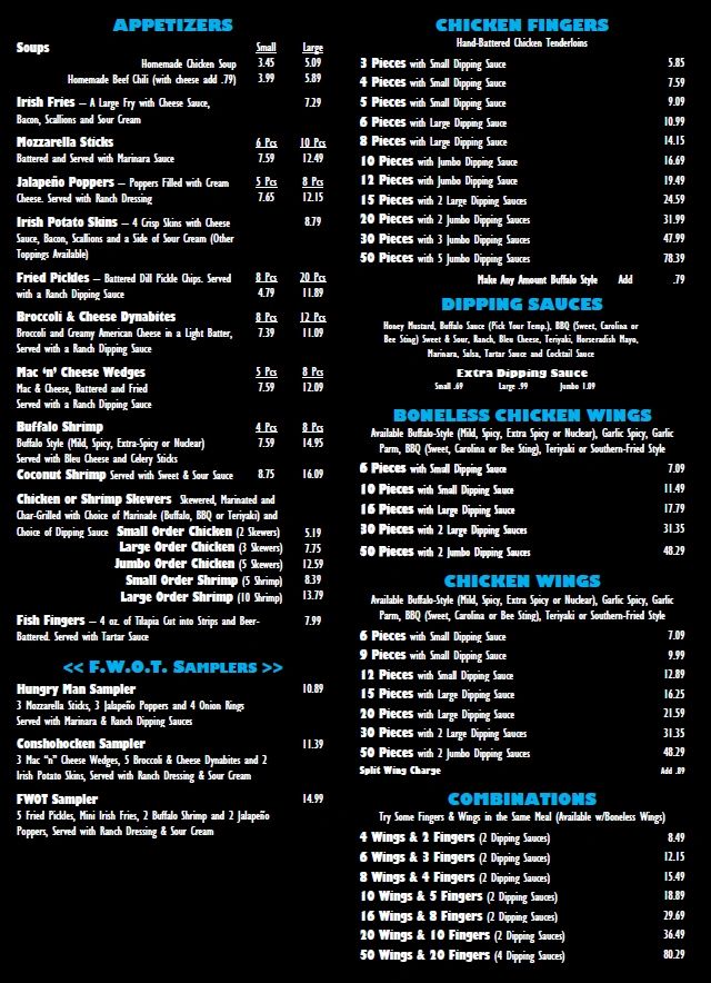 5 Fried Pickles, Mini Irish Fries, 2 Buffalo Shrimp, 2 Poppers w/ Ranch & Sour Cream.